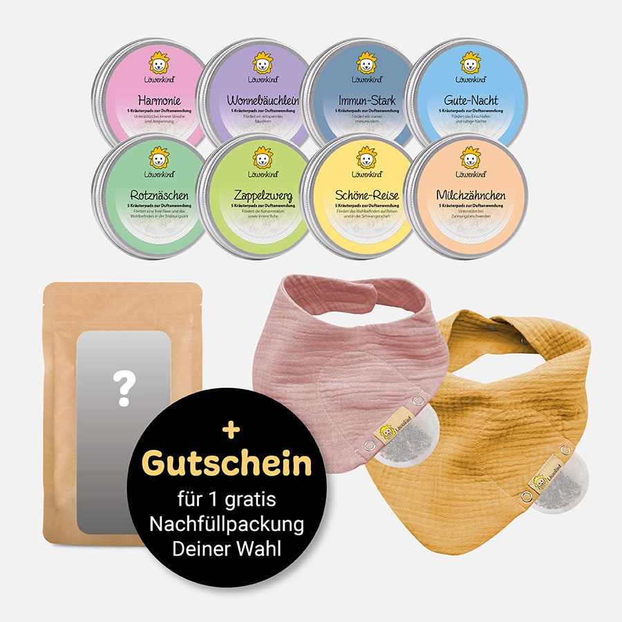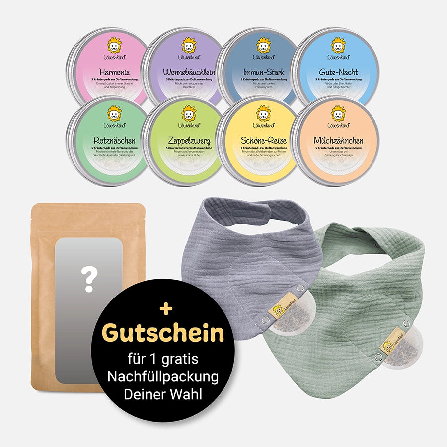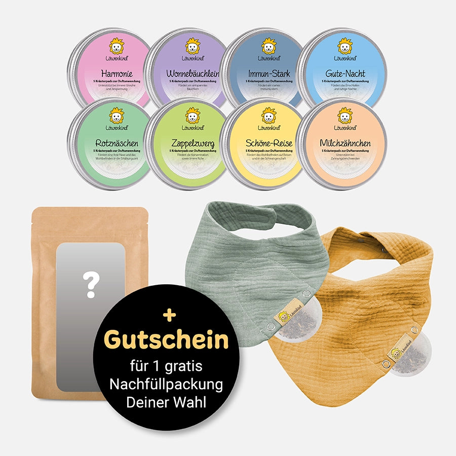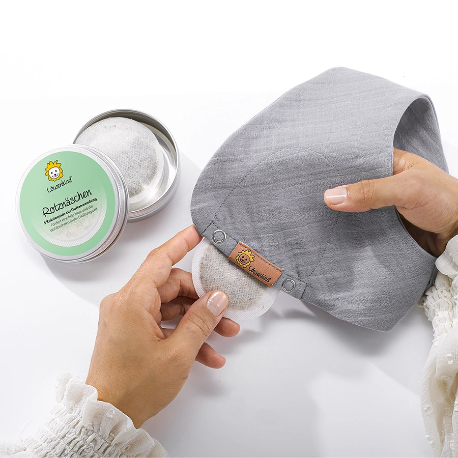 Das Kräuterpad wird ins Löwenkind Halstuch gesteckt. Dank der Körperwärme wird der Duft der Kräuter verstärkt.