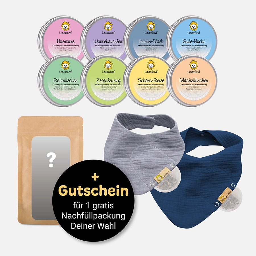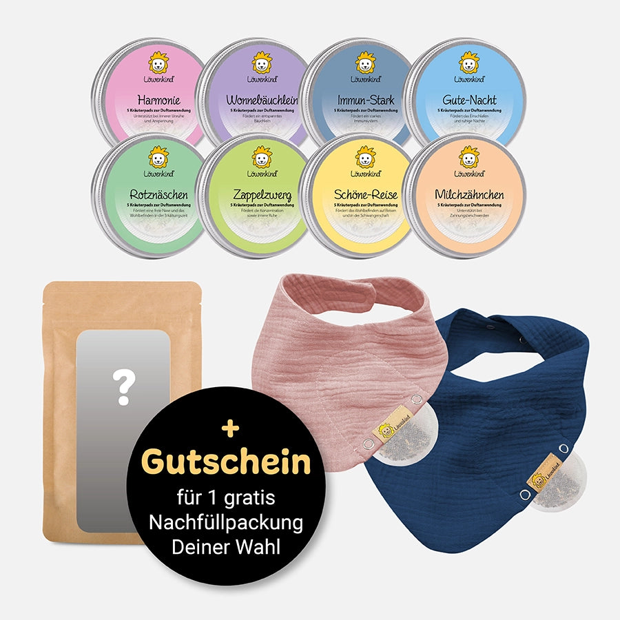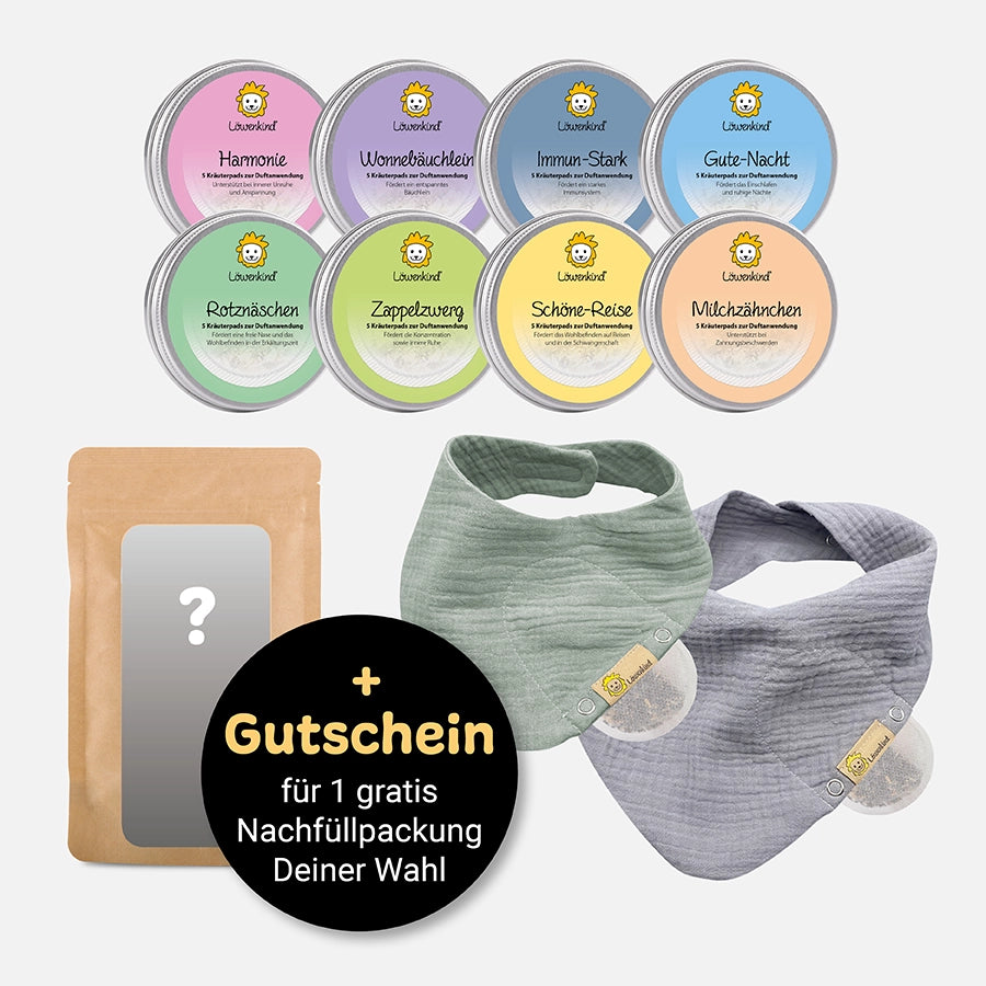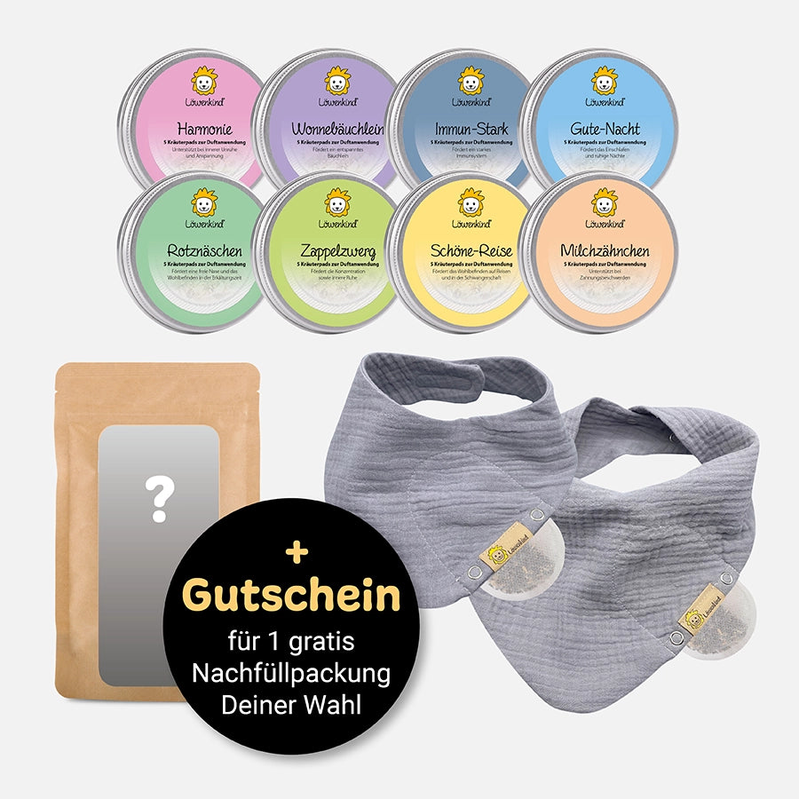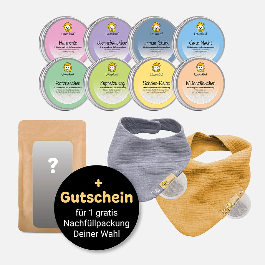 Das Kräuterpad wird ins Löwenkind Halstuch gesteckt. Dank der Körperwärme wird der Duft der Kräuter verstärkt.